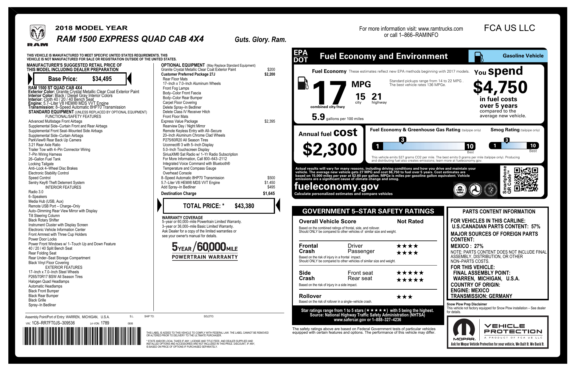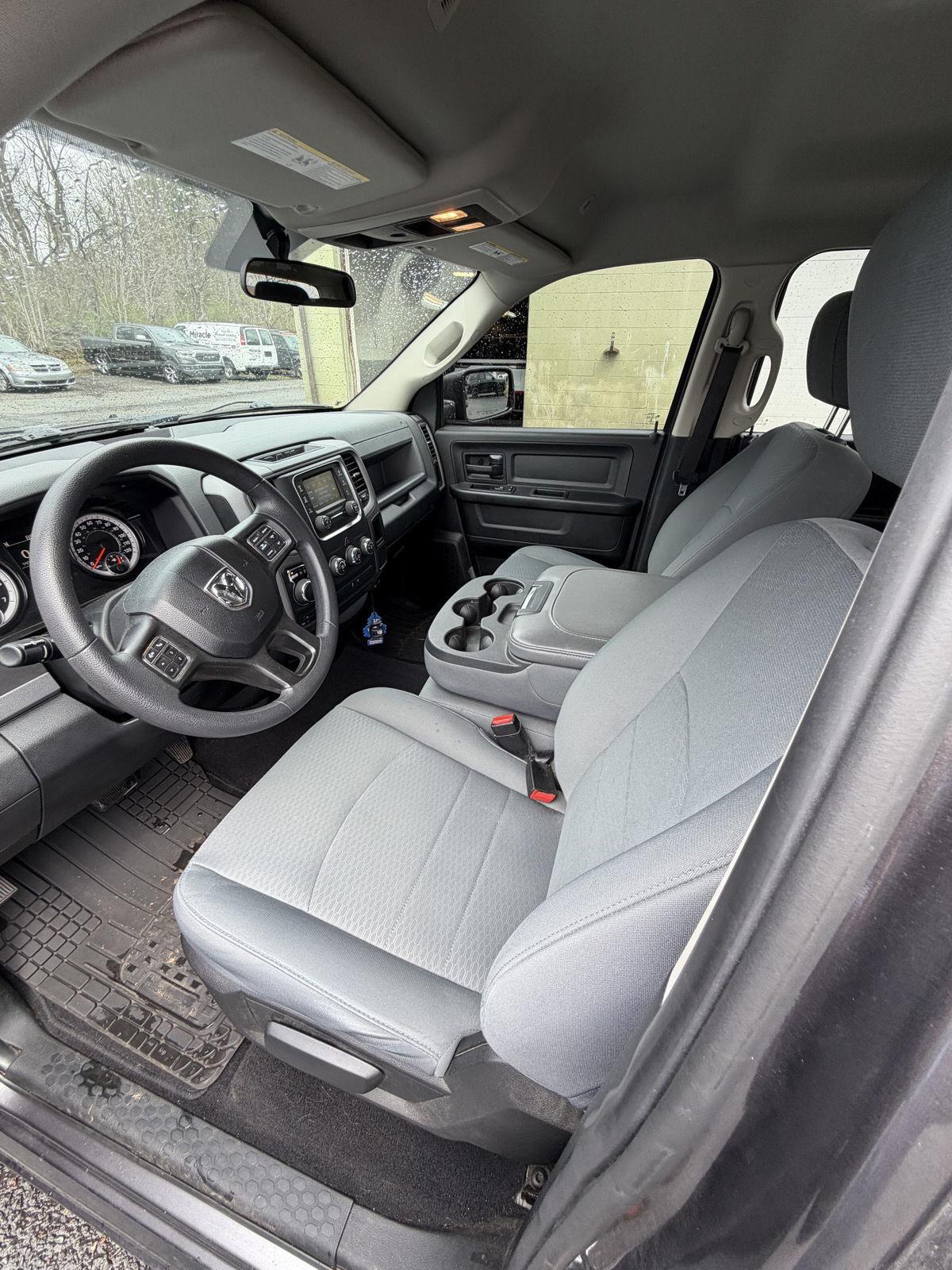 Meet the 2018 RAM 1500 Express — a tough, practical pickup finished in sleek Gray with a Black interior. Seating for six and a front split-bench give you versatile cargo and passenger options, while generous leg- and shoulder-room ensures comfort on every drive. Built for confidence: 4‑wheel ABS, disc brakes, multiple airbags, child-safety locks and anti-theft protection, plus rugged P265/70R17 tires and a durable live rear suspension. Backed by factory coverage (36 months/36,000 miles basic, 60 months/60,000 miles powertrain; rust coverage applies—ask for details). Ready to work and ready to go — come take it for a test drive today.