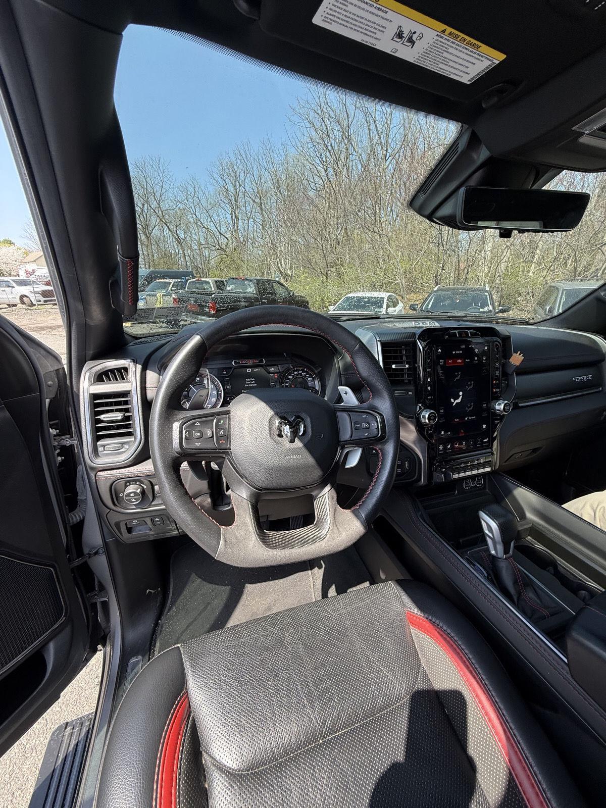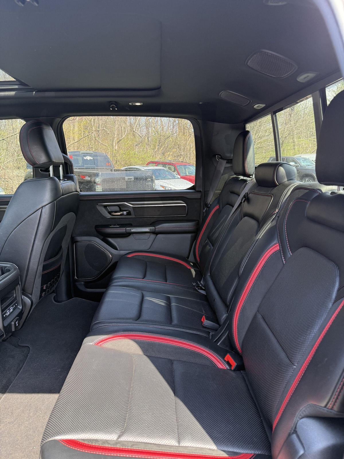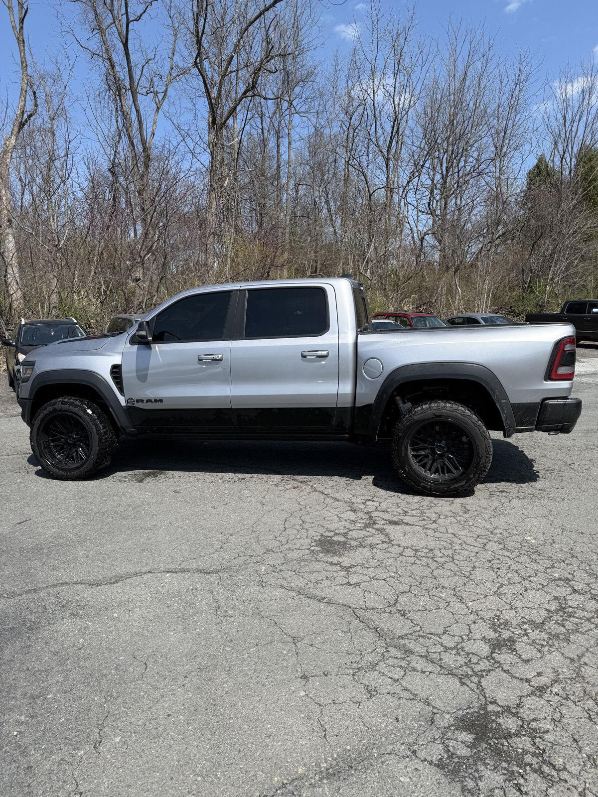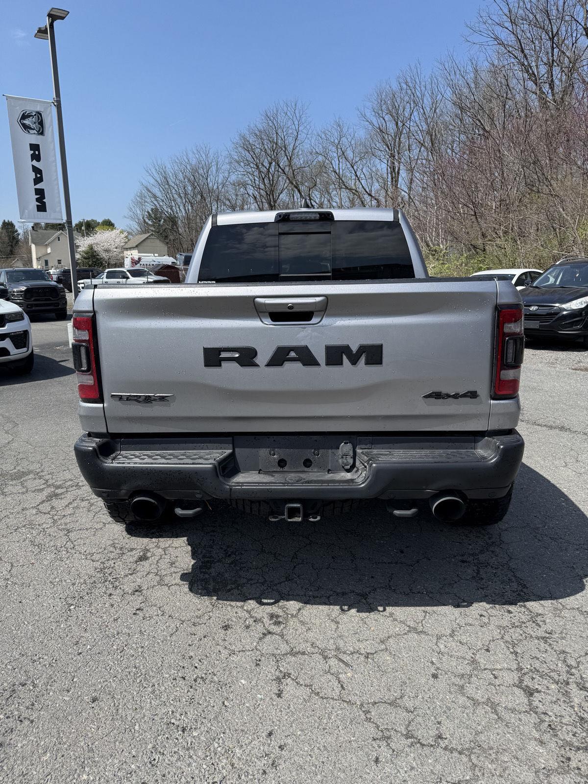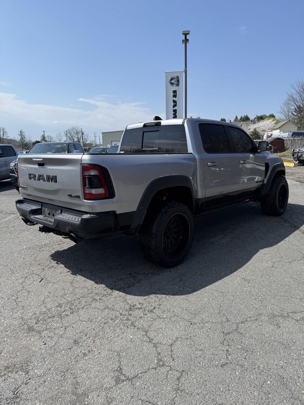 Turn heads in this 2021 RAM 1500 TRX — Silver exterior with a sleek Black interior — where supertruck capability meets premium comfort. Equipped for anything, it delivers confident 4WD performance with locking differential, ABS, traction and stability control, and heavy-duty brakes, plus a locking tailgate and vehicle anti-theft for added security. The cabin pampers with heated/cooled power seats with memory, heated leather steering wheel, dual-zone climate, power sunroof, upgraded navigation and subwoofer, keyless entry/remote start, and rain‑sensing wipers. Rugged details like alloy wheels, running boards and a full-size spare round out this ready-for-anything package — backed by generous basic and powertrain warranties. Call today to schedule your test drive.